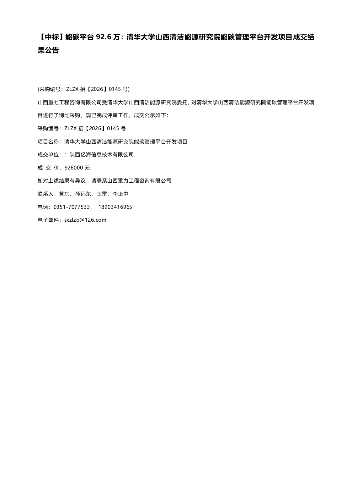 【中标】能碳平台92.6万:清华大学山西清洁能源研究院能碳管理平台开发项目成交结果公告