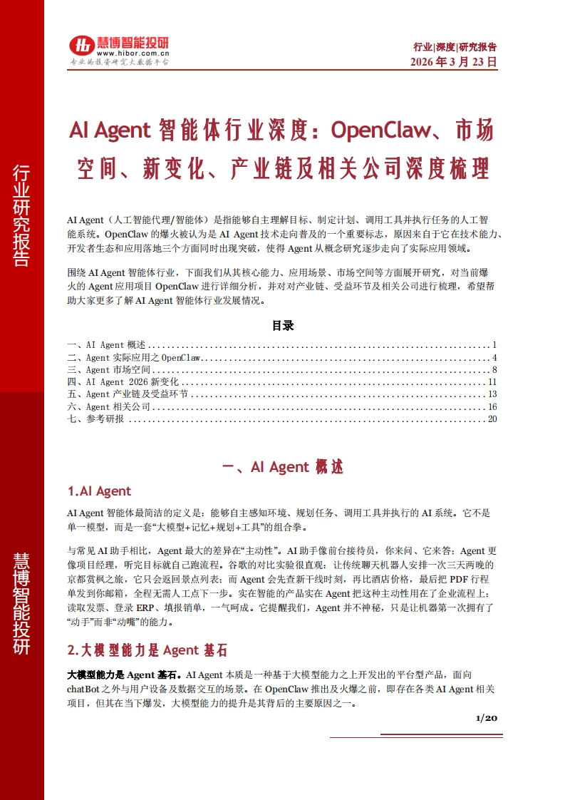 慧博智能投研:AI Agent智能体行业深度:OpenClaw、市场空间、新变化、产业链及相关公司深度梳理