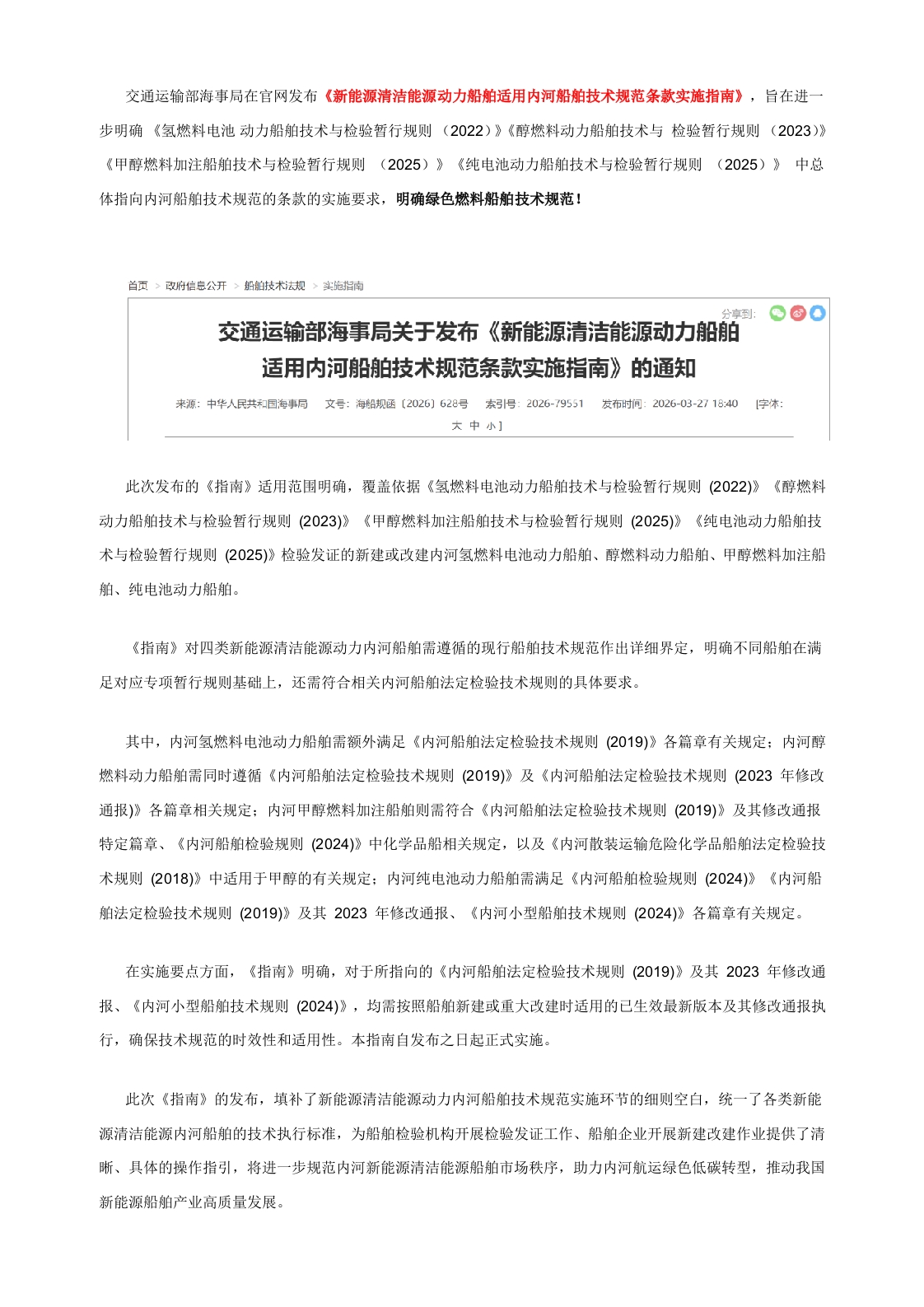 【政策】新能源清洁能源动力船舶适用内河船舶技术规范条款实施指南