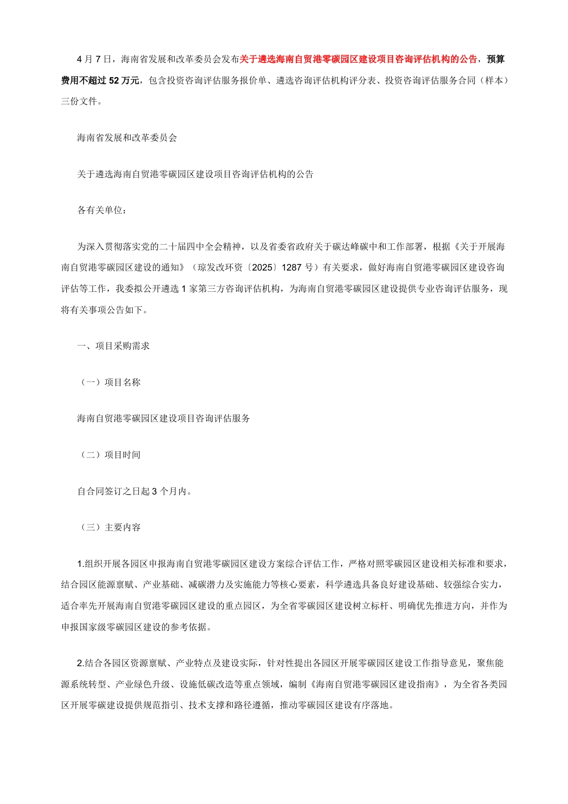 【政策】关于遴选海南自贸港零碳园区建设项目咨询评估机构的公告