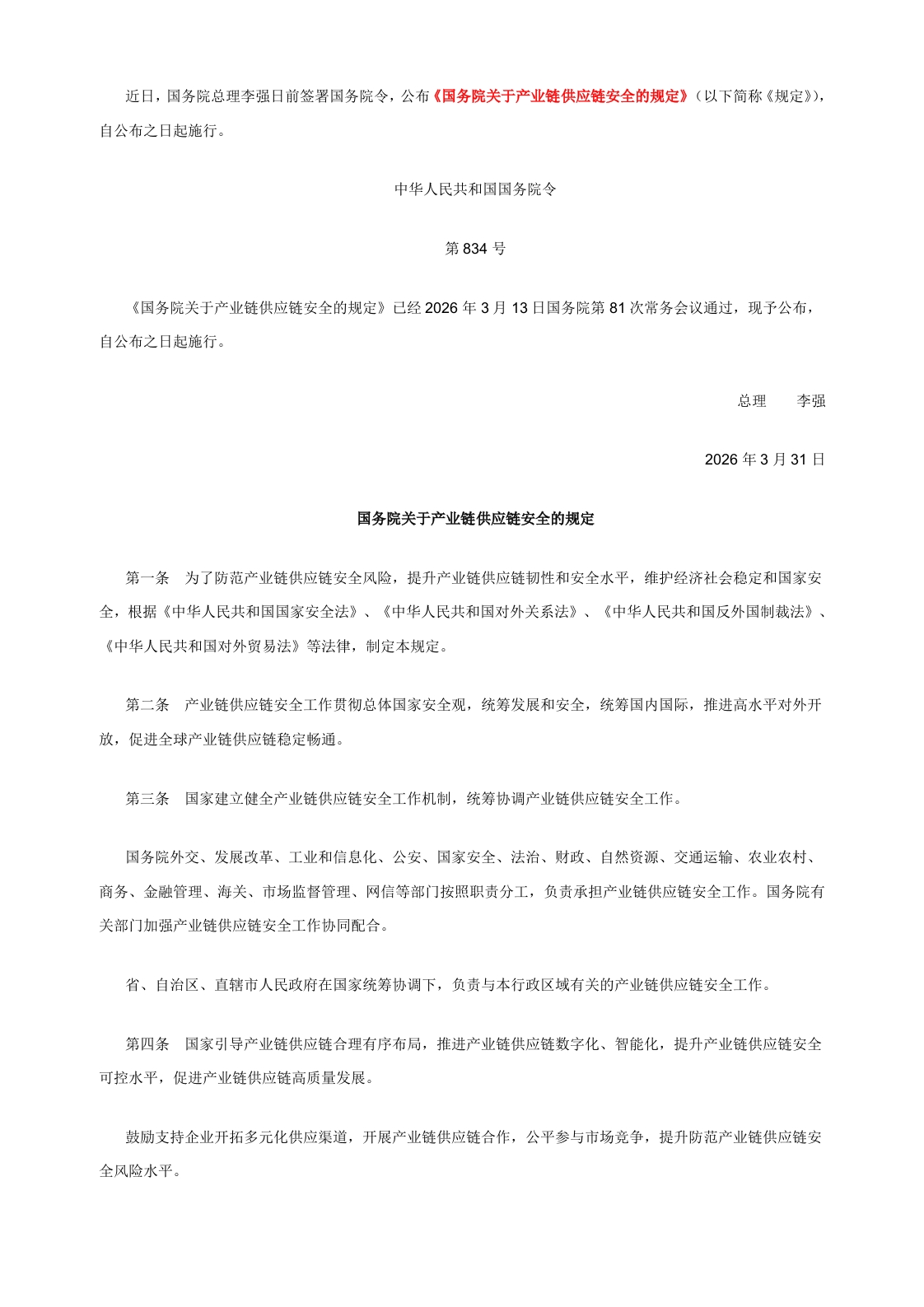 【政策】国务院关于产业链供应链安全的规定