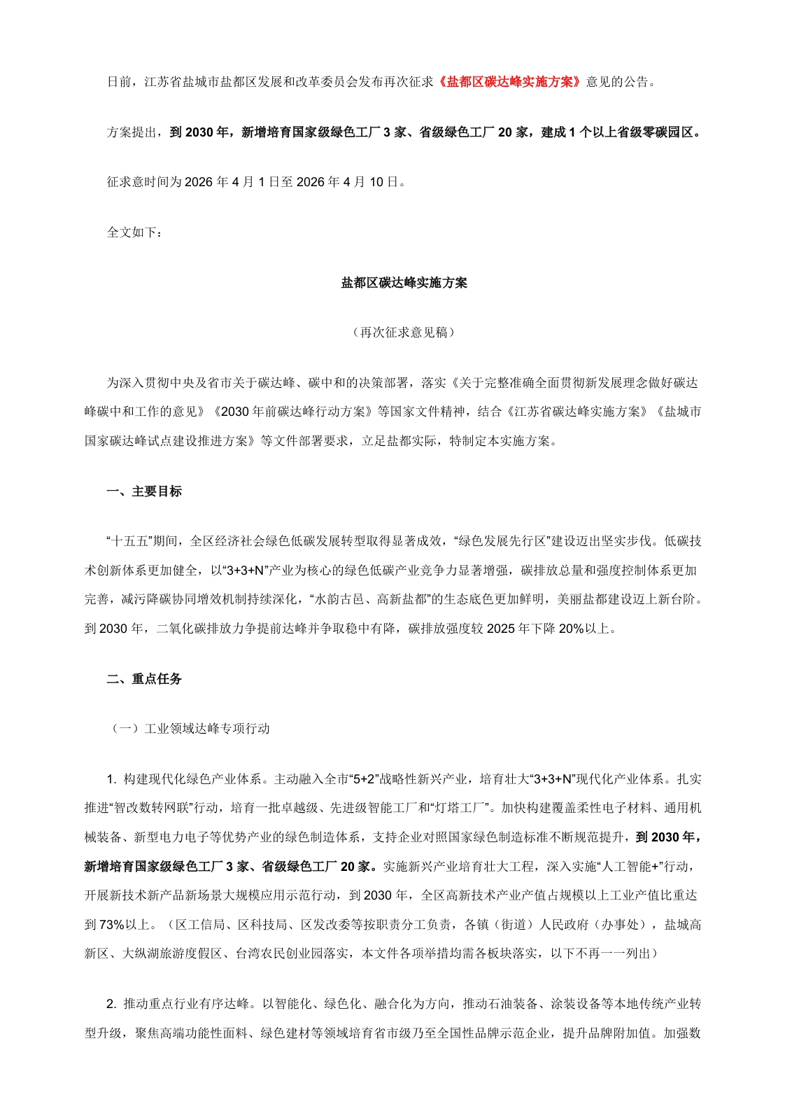 【政策】江苏省盐城市盐都区碳达峰实施方案