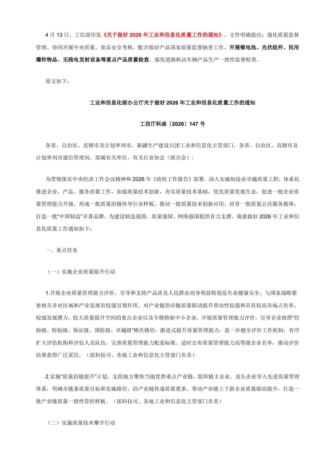 首页双碳基础知识碳达峰碳中和其他报告文献【政策】关于做好2026年工业和信息化质量工作的通知