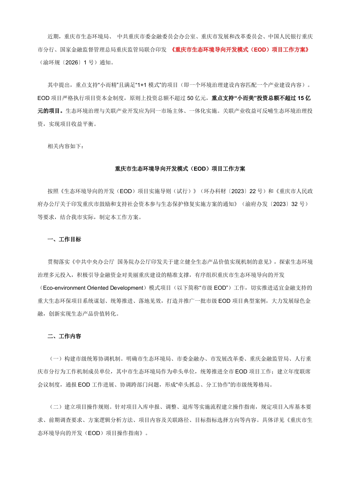 首页双碳基础知识碳达峰碳中和其他报告文献【政策】重庆市生态环境导向开发模式(EOD)项目工作方案