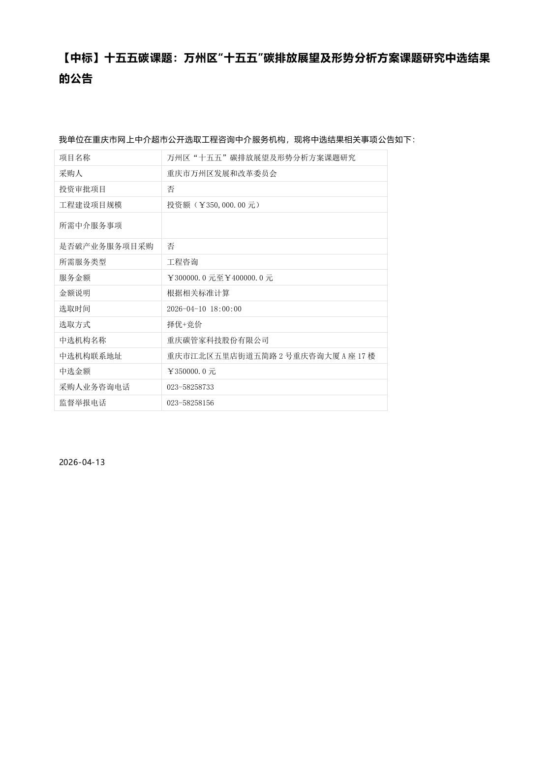 【中标】十五五碳课题:万州区“十五五”碳排放展望及形势分析方案课题研究中选结果的公告