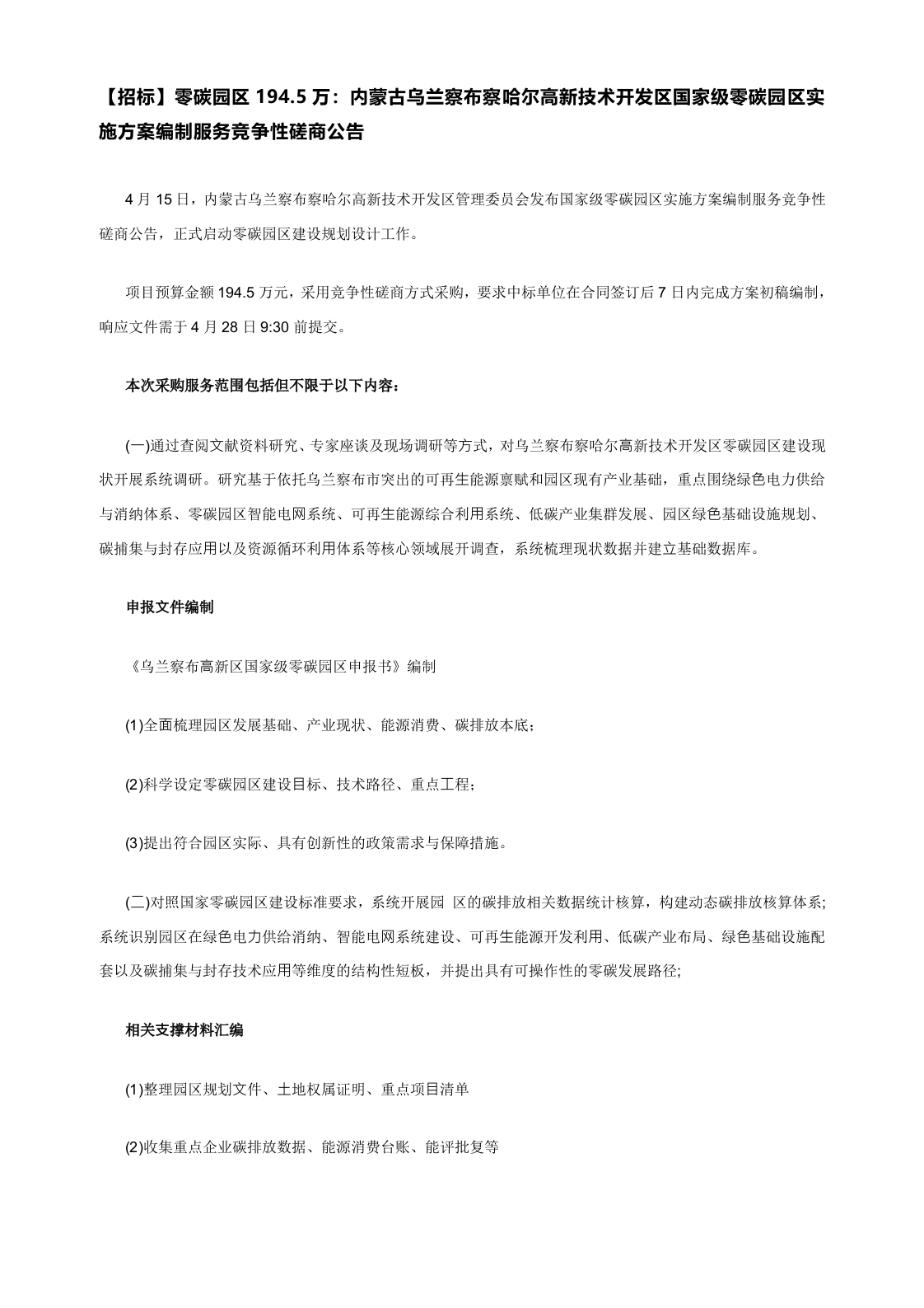 【招标】零碳园区194.5万:内蒙古乌兰察布察哈尔高新技术开发区国家级零碳园区实施方案编制服务竞争性磋商公告