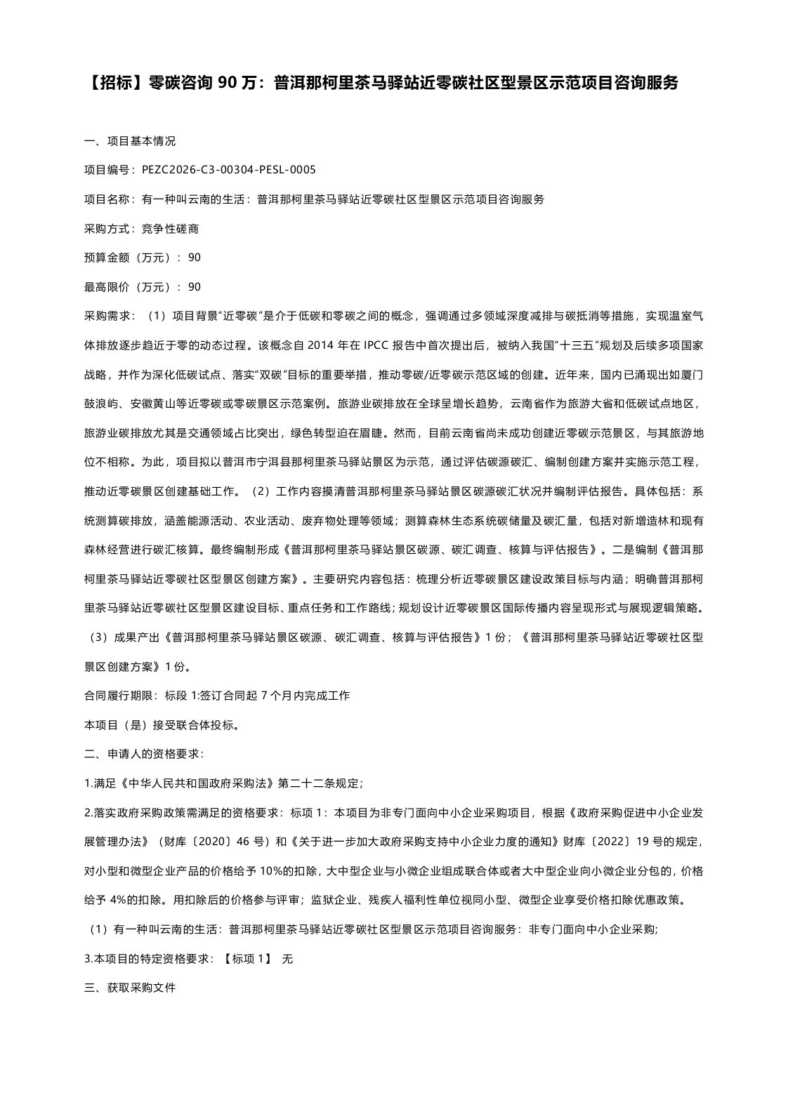 【招标】零碳咨询90万:普洱那柯里茶马驿站近零碳社区型景区示范项目咨询服务