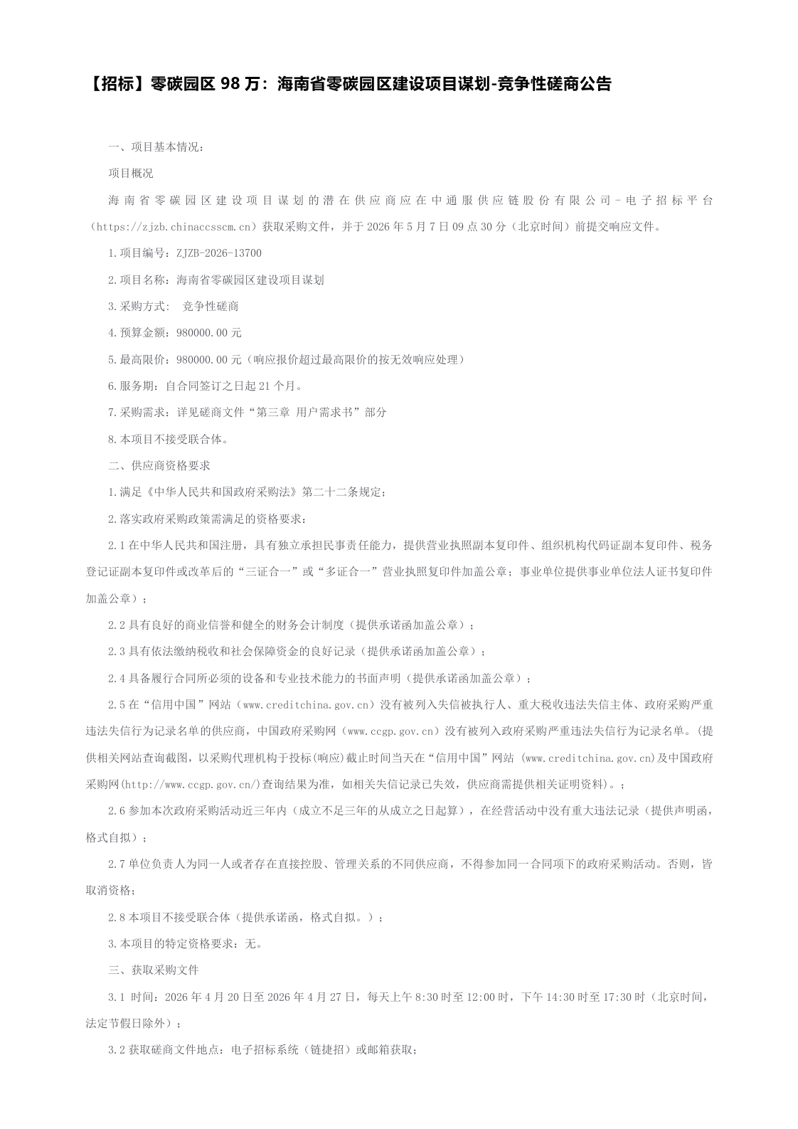 【招标】零碳园区98万:海南省零碳园区建设项目谋划-竞争性磋商公告
