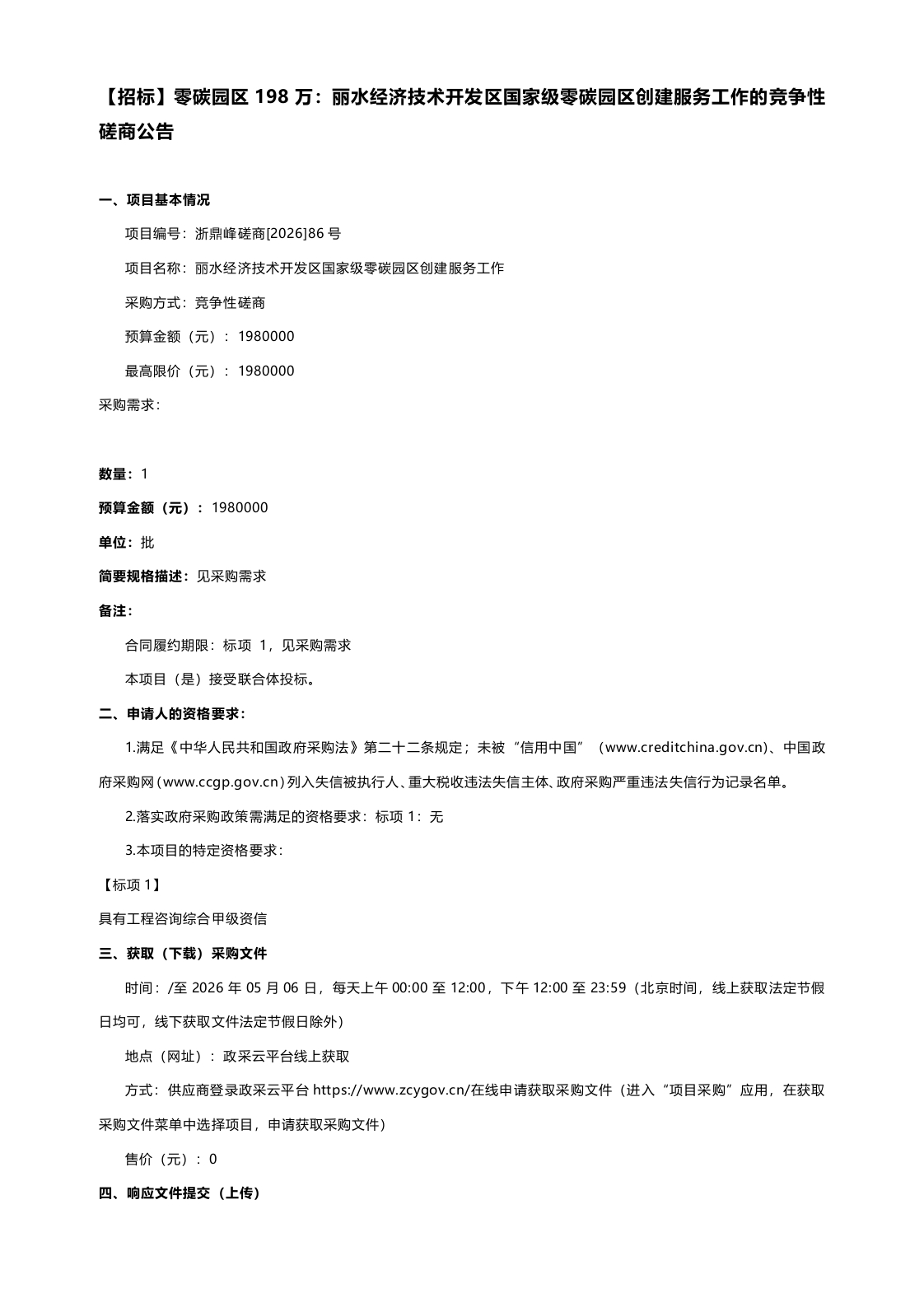 【招标】零碳园区198万:丽水经济技术开发区国家级零碳园区创建服务工作的竞争性磋商公告