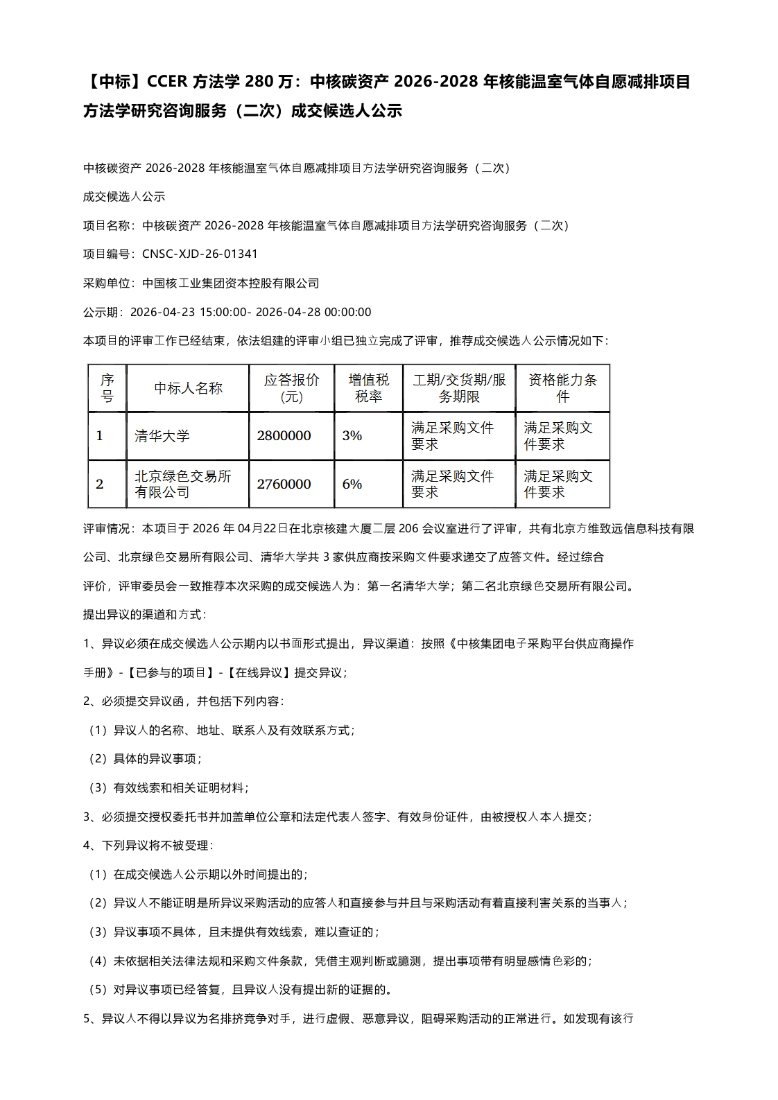 【中标】CCER方法学280万:中核碳资产2026-2028年核能温室气体自愿减排项目方法学研究咨询服务(二次)成交候选人公示