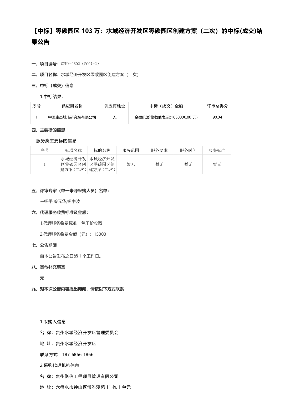 【中标】零碳园区103万:水城经济开发区零碳园区创建方案(二次)的中标(成交)结果公告