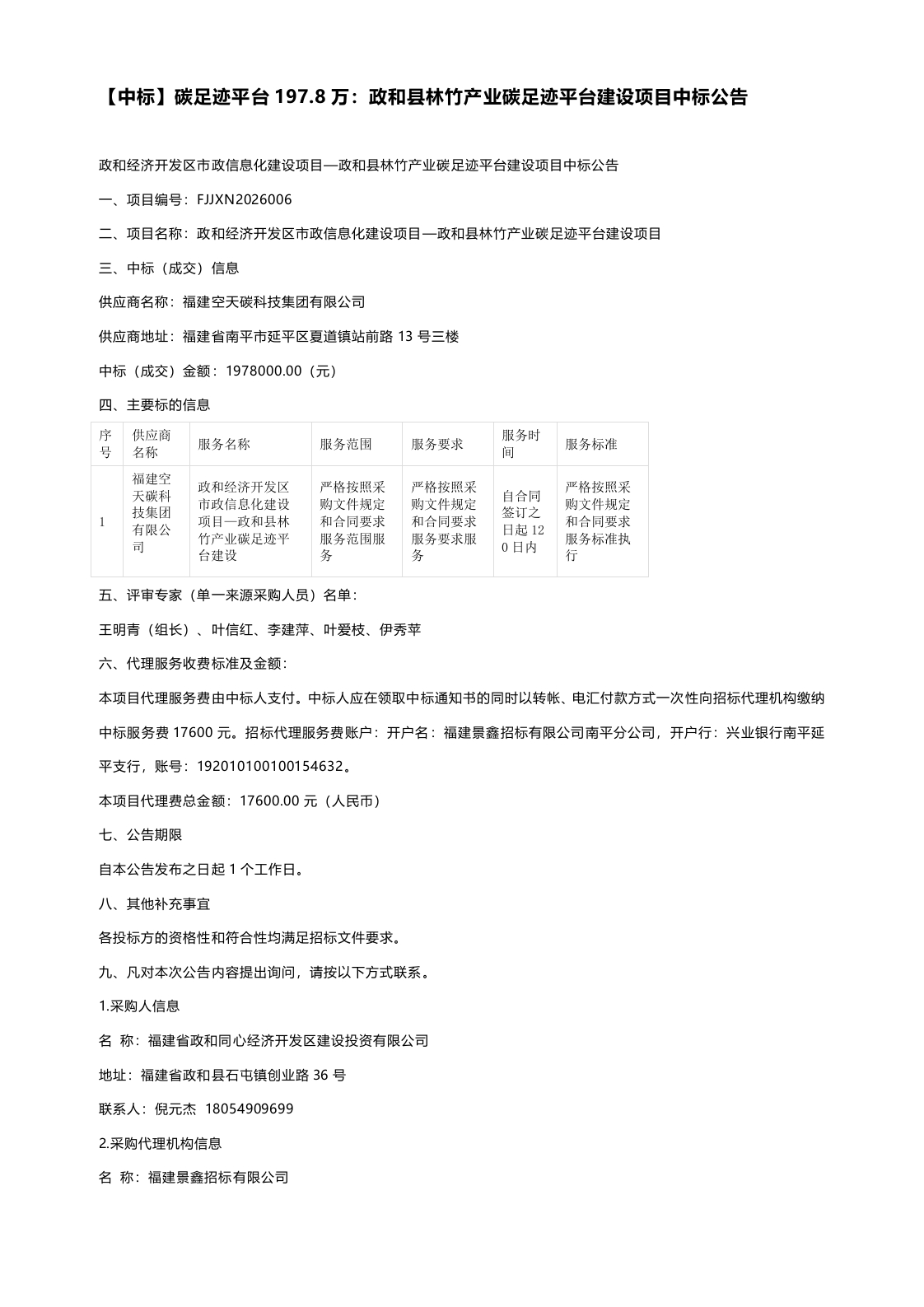 【中标】碳足迹平台197.8万:政和县林竹产业碳足迹平台建设项目中标公告